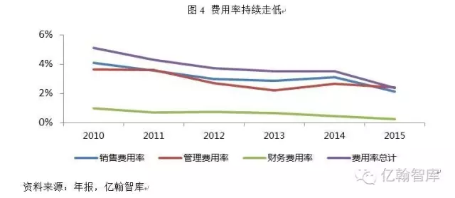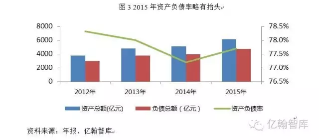 随着经营规模的扩大,公司资产规模稳步提升,截止2015年年末,公司资产达6112.9亿元,资产规模持续行业领先,保持行业龙头地位。伴随业务规模的扩大,公司外部债务规模和预收款项规模增加,使得负债水平有所上升,为 4749.86 亿元,同比增长 21.01%,导致其资产负债率略微上涨至 77.70%,高于 2014 年末资产负债率 0.5 个百分点。公司2012-2015年资产负债率持续维持高位,均高于77%。剔除并不构成实际偿债压力的预收账款后,2015年公司其它负债占总资产的比例为42.92%(2014年底:41.46%)。公司净负债率(有息负债减去货币资金,除以净资产)为19.30%(2014年底:5.41%),继续保持在行业较低水平。公司成本控制能力较强,2011-2015年,销售费用率、管理费用率、财务费用率在2014年略有抬头,但整体均呈下降趋势,费用率持续走低。