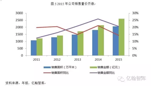 得益于政策的逐步宽松,公司持续强化其产品竞争力,不断丰富产品服务体系,公司销售业绩实现了稳定增长。2015 年公司实现销售面积 2067.1万平方米,销售金额 2614.7 亿元,同比分别增长 14.3%和20.7%,按2015年全国商品房销售金额人民币 87280.8 元计算,公司在全国的市场占有率上升至 3.00%(2014 年:2.82%)。2015 年公司所销售的住宅中,144平方米以下中小户型普通商品房套数占比为93%。公司在中国大陆坚持聚焦城市圈带的发展战略。截至2015年底,公司进入中国大陆66个城市,分布在以珠三角为核心的广深区域、以长三角为核心的上海区域、以环渤海为核心的北京区域,以及由中西部中心城市组成的成都区域。公司以“国际化”为发展方向,2013年开始投资海外项目。截至2015年底,公司已进入旧金山、香港、新加坡、纽约、伦敦等5个海外城市。2015 年公司的销售业绩中,海外项目贡献销售面积 2.8万平方米,贡献销售收入人民币 28.8 亿元。2015 年公司房地产项目结算面积 1704.6万平方米,同比增长 35.4%;结算收入人民币 1902.1 亿元,同比增长 32.5%;房地产业务的结算毛利率为19.46%(2014年:20.76%)。截至报告期末,公司合并报表范围内有1840.9万平方米已售资源未竣工结算,合同金额合计约 2150.5亿元,较 2014 年末分别增长10.2%和10.5%,为公司2016年业绩提供了有利保障。预计2016年,公司会继续销售量价齐涨态势,再度实现销售“小阳春”。